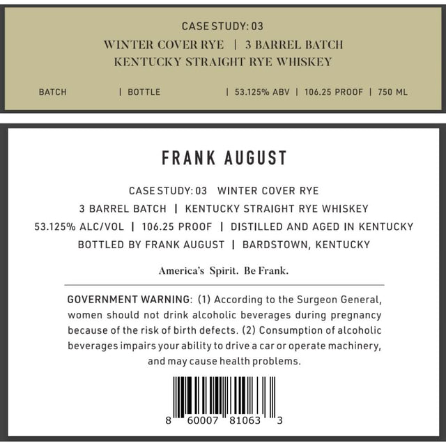 Introducing Frank August Case Study: 03 - a small-batch, winter cover rye, distilled and aged in Kentucky. Crafted with care and bottled by Frank August in Bardstown, this Kentucky Straight Rye offers a smooth and rich drinking experience, embodying the essence of whiskey tradition.