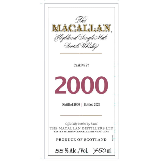 The glorious autumnal russet hue of this 2000 Fine & Rare release from The Macallan is attributable to almost a quarter of a century of maturation in a first fill sherry seasoned European oak butt. A comforting resinous aroma with subtle hints of fresh vanilla, ground coffee and white chocolate on the nose mingles with woody brazil nuts and a whisper of cinnamon. On the palate a fruity, buttery sweetness of chocolate covered raisins and brittle toffee gives way to the rich complexity of oak and forest fruits. Subtle cinnamon notes lend a spicy warmth throughout. The finish of rich oak, citrus peel, and lingering sweet spice dances long on the palate. Filled on 24th February 2000 and bottled 24 years later in celebration of the 200th anniversary of The Macallan, this single cask, the first Fine & Rare release distilled in the new millennia, is presented at its natural cask strength.